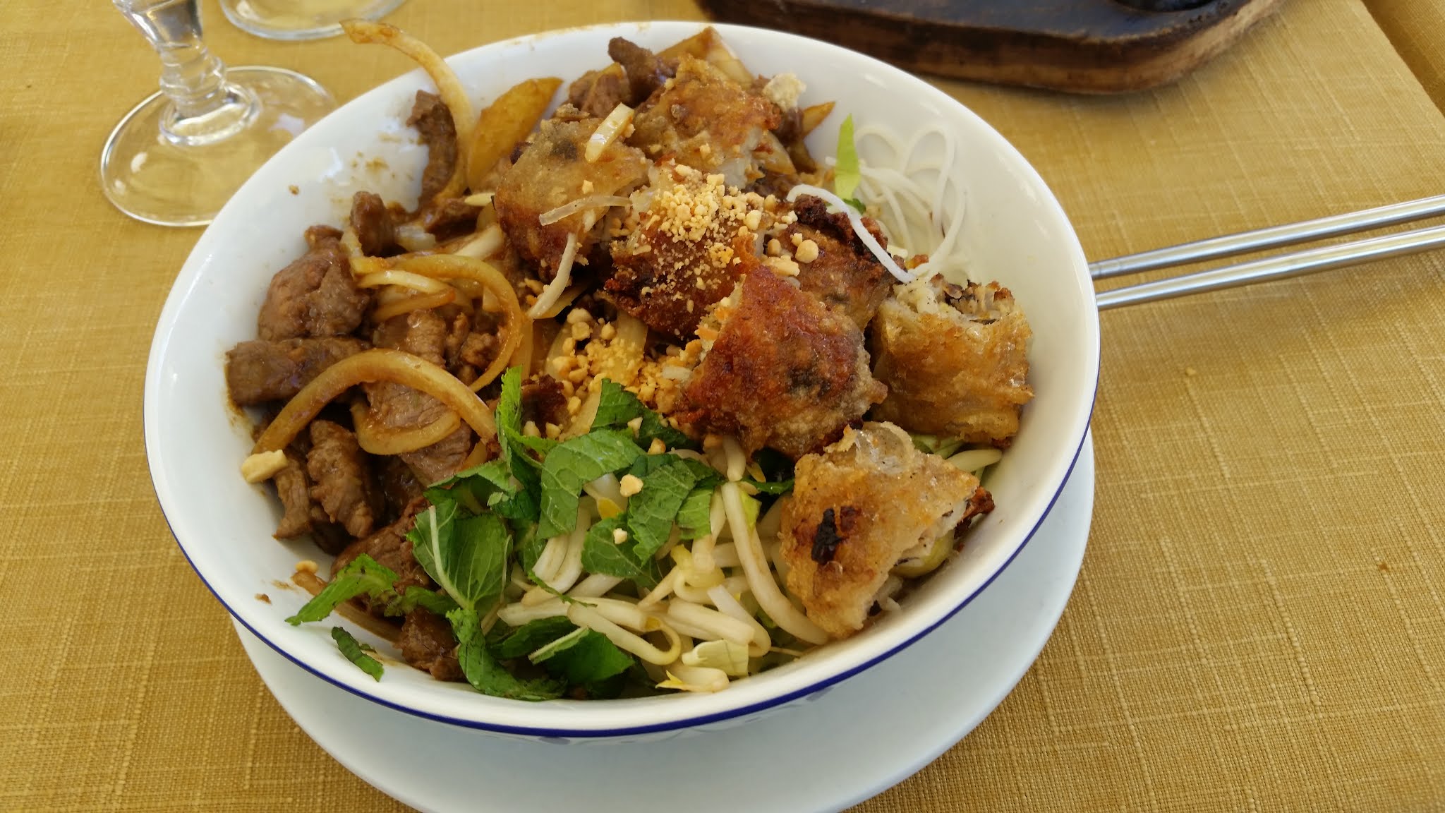 Plus que bof Plats sans grandes saveurs et très gras. Nems servis sans salade, sans menthe. Mais le rouleau de printemps était bon. Assiette de 3 viandes avec un canard laqué sans sauce et sec, la Brochette de poulet, pas de souci, le travers de porc trop sec et sans goût. Service, très bien, par contre, on m a installé sur une table avec une nappe en papier dégueulasse... Je le trouve relativement cher pour la qualité amené en assiette. Les habitués seront outrés, les gens de passage, je vous conseille d essayer un autre restau.
