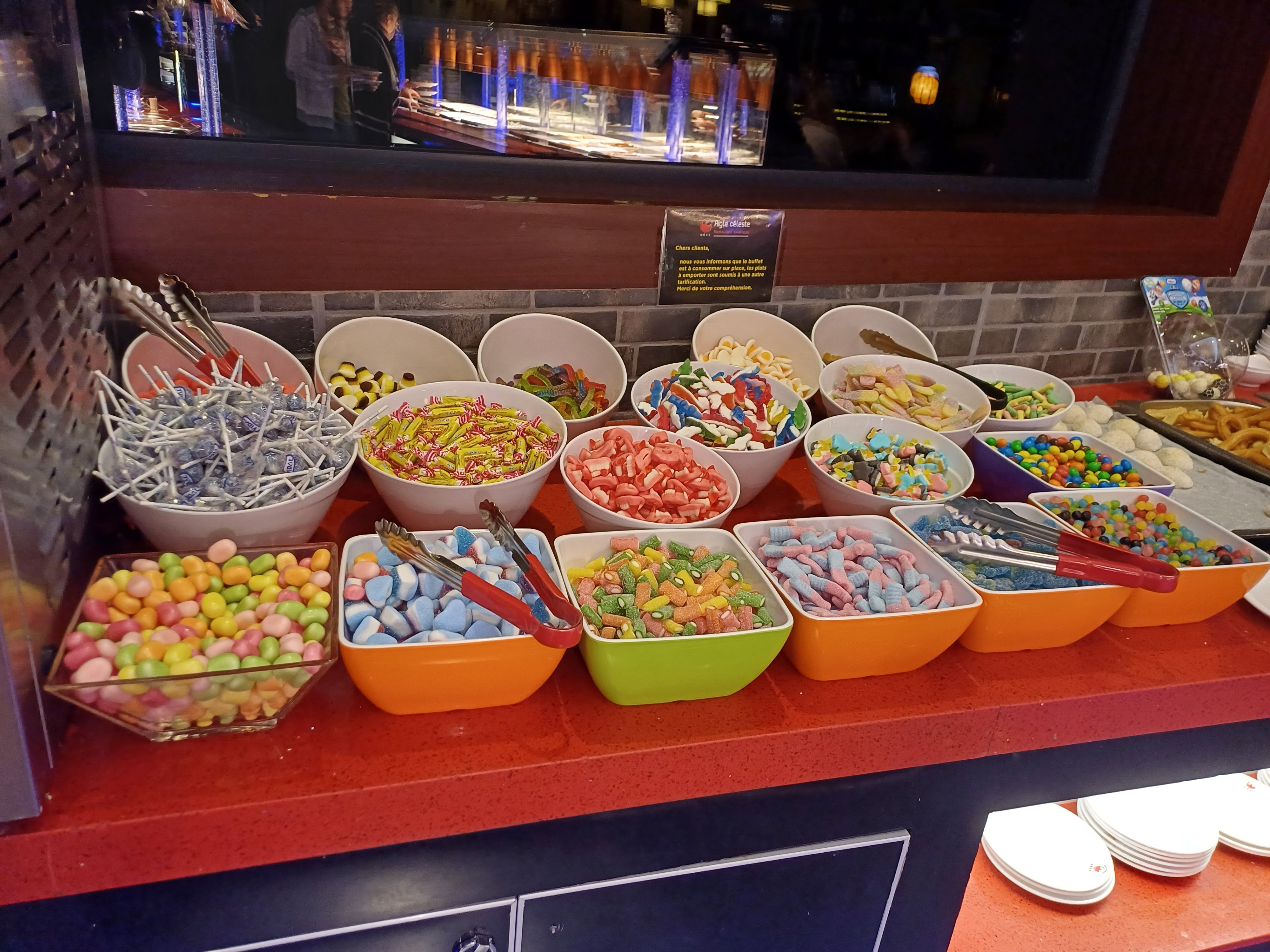 Très bon buffet avec grand choix. Personnel très souriant et agréable. Grand choix de bonbons également: le problème étant que des personnes se servent avec leurs mains plus ou moins propres en piochant des grosses poignées..., sans utiliser les ustensiles à disposition et en en faisant tomber partout, en en remettant également dans les saladiers... Un peu l'anarchie au niveau des bonbons donc...