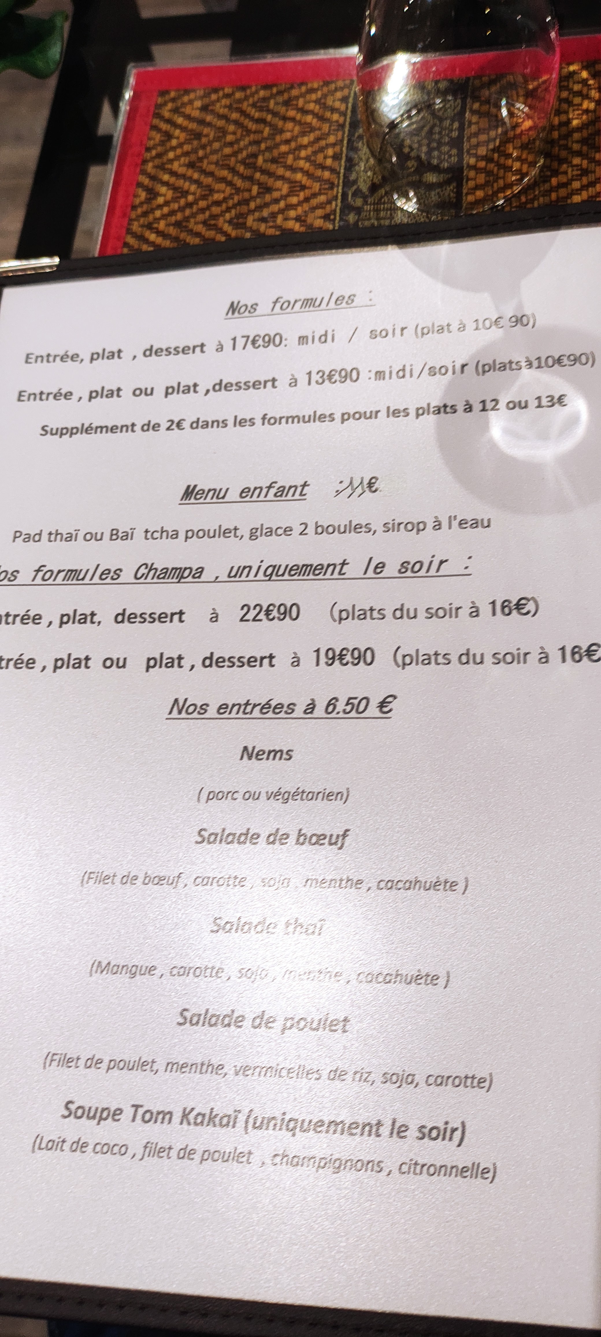 Posté le 14/08/2017 à 13:23"Le Champa est un restaurant très sympa. Le personnel est très accueillant, les plats sont très bons, et les tarifs plus qu'abordables! Nous y avons passé un très bon moment. Seul bémol que je retiendrai, la déco et l'ambiance ne correspondent pas vraiment au type de cuisine proposé. C'est peut-être une volonté de la part des propriétaires, mais je dois avouer que j'aurai bien aimé sentir une petite touche de voyage dans l'ambiance générale!"