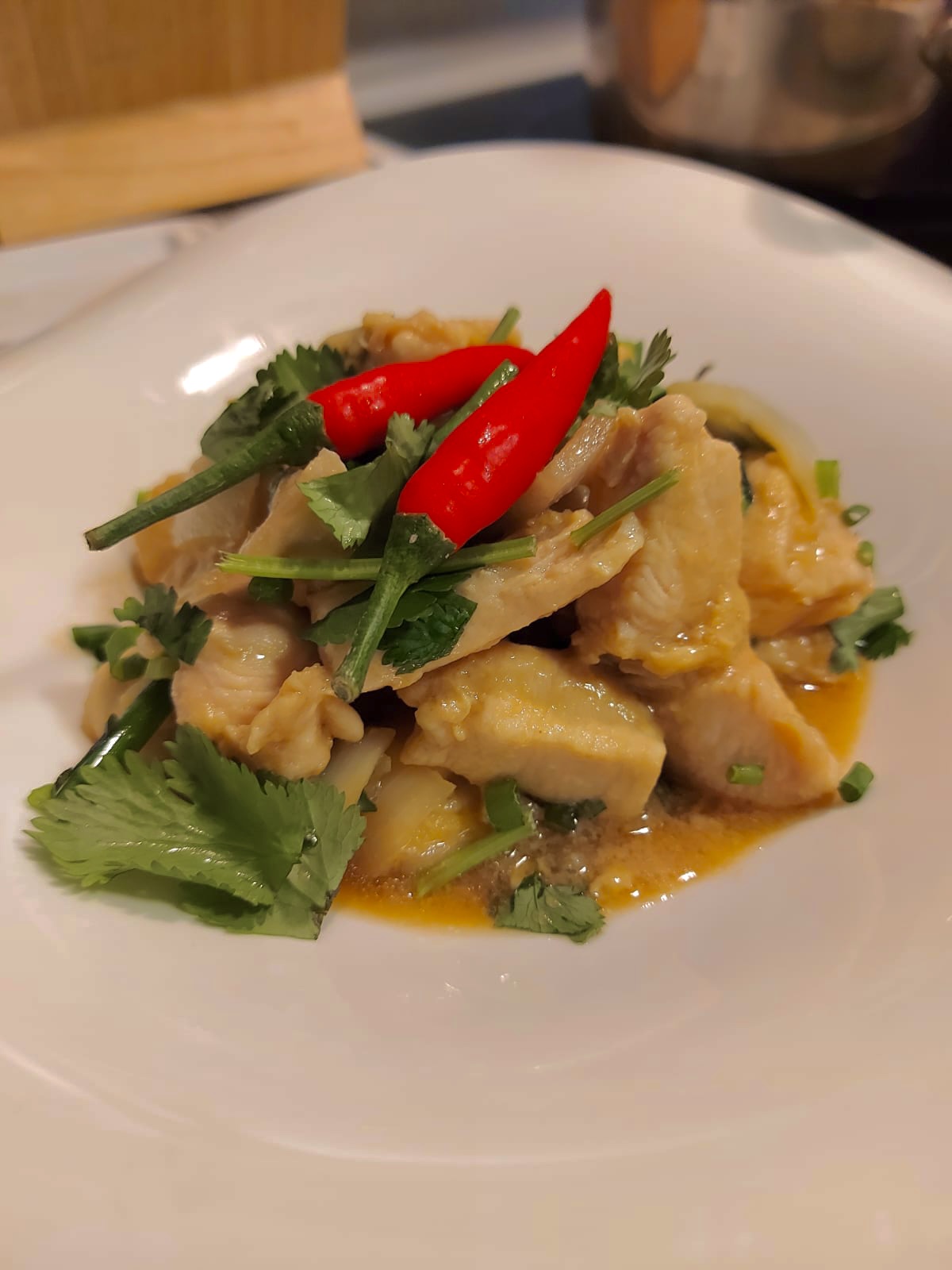 Merveilleux, un régal !!! Le poulet au curry vert était excellent ! Désolée de ne pas avoir goûter l'ananas mais je voulais rester sur le goût du plat 😊 On ne regrette pas d'avoir pédalé 5 km de plus depuis le canal