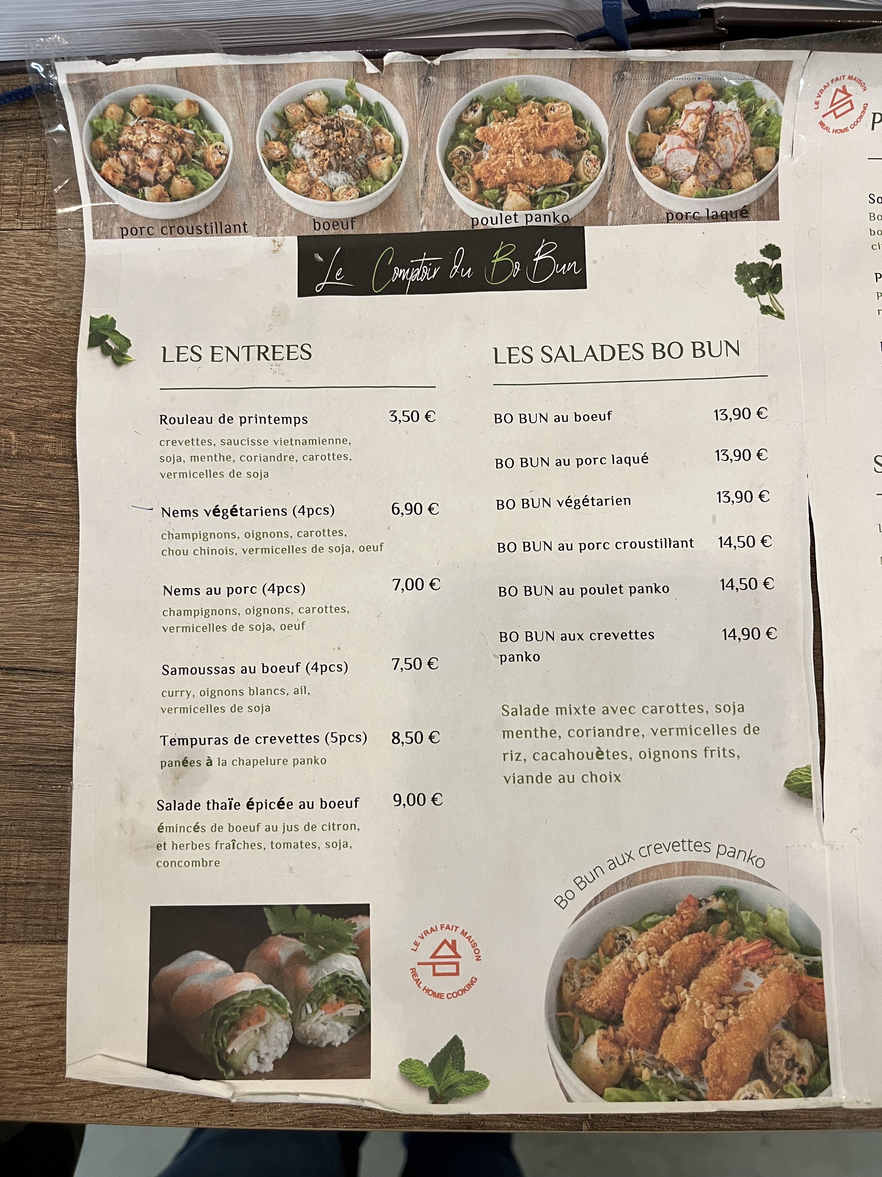 Bonjour Merci de votre visite et pour votre commentaire. En plus de nos salades Bo Bun, nous proposons des plats du jour en semaine. Saveurs authentiques garanties !
