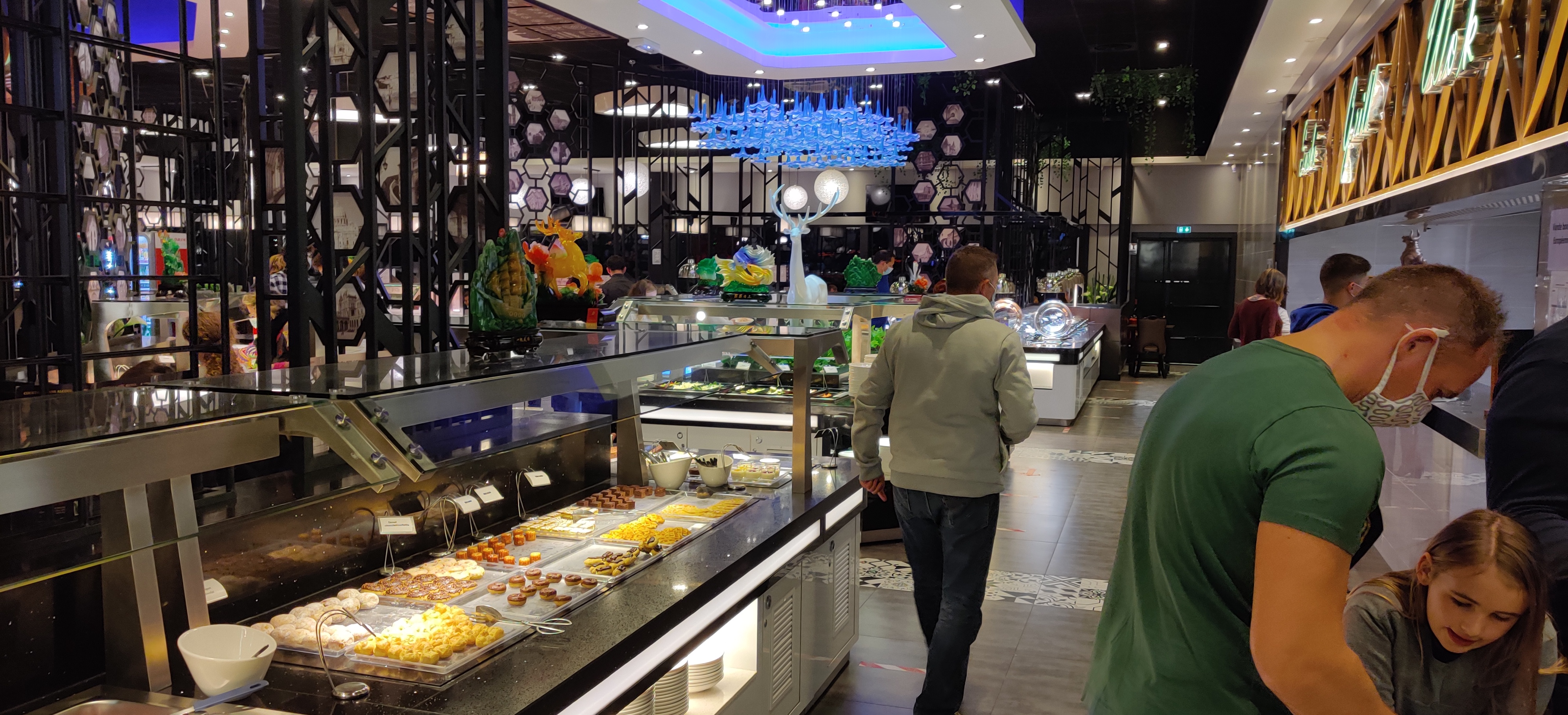 Nous sommes allez manger pour une première fois en famille Je trouve la décoration super La disposition des plats chauds ou les plats froids bien présentés Un large choix sur les desserts Et la petite salle de jeux pour enfants super avec une vue direct sur écran Merci au personnel souriant