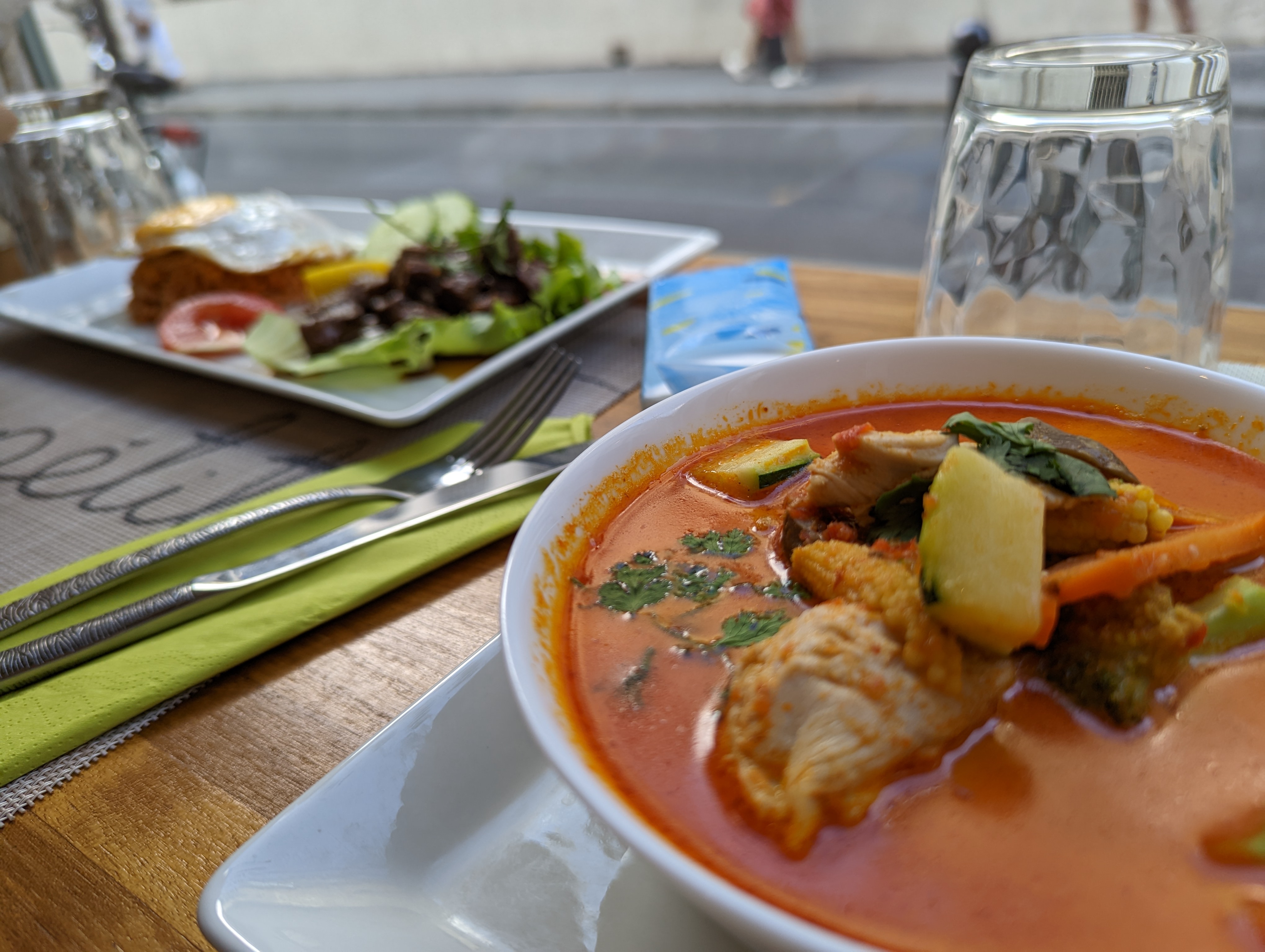 Le Tom Yum Goong est particulièrement délicieux ! aimer beaucoup! Le curry rouge est aromatisé à la noix de coco et j'aimerais essayer d'autres saveurs de curry à l'avenir !