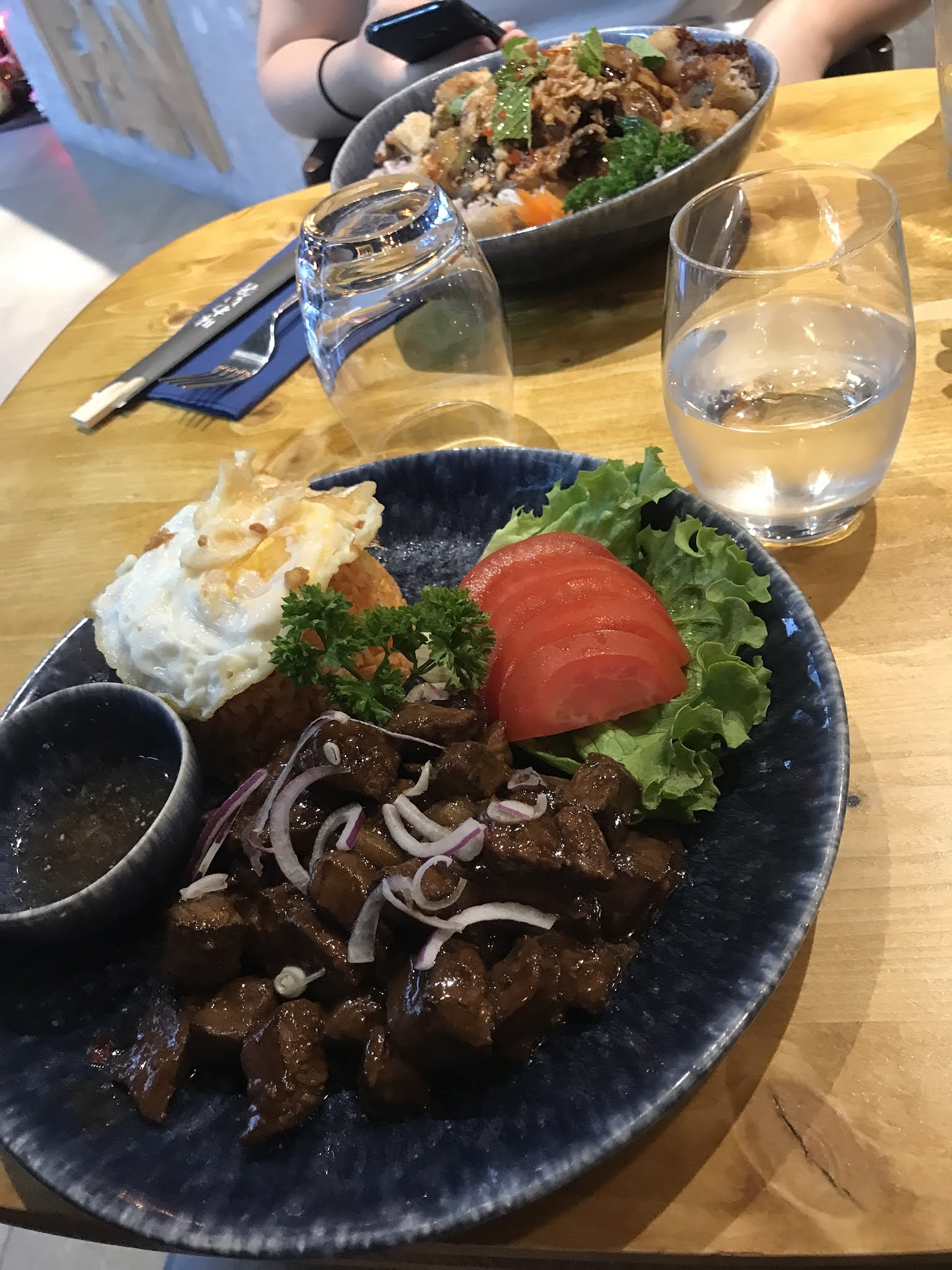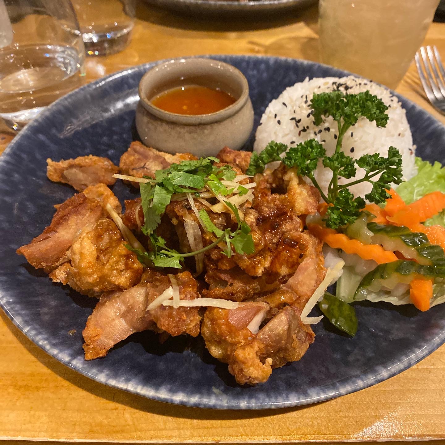 Posté le 07/02/2025 à 05:51"Loht Cha Poulet ou Crevettes (possible en végétarien) : Udon de blé et d'œufs avec omelette effilée, pousses de soja, ciboulette & sauce soja Mifan (15.50€) Khao Pad Poulet ou Crevettes (possible en végétarien) ; Riz à la thaïlandaise (tomaté) sauté avec oignons frits, échalotes, ail, carottes, cœufs, ciboulette, piment et sauce soja (14.50€) Poulet Croustillant Ginger & Rice : Poulet Croustillant à la sauce soja et gingembre frais parsemé de coriandre, accompagné de riz blanc, de petits légumes croquants marinés et de sauce aigre-douce (15.50€) Excellent restaurant dans un super cadre, pensez à réserver car les plats sont vraiment bons"