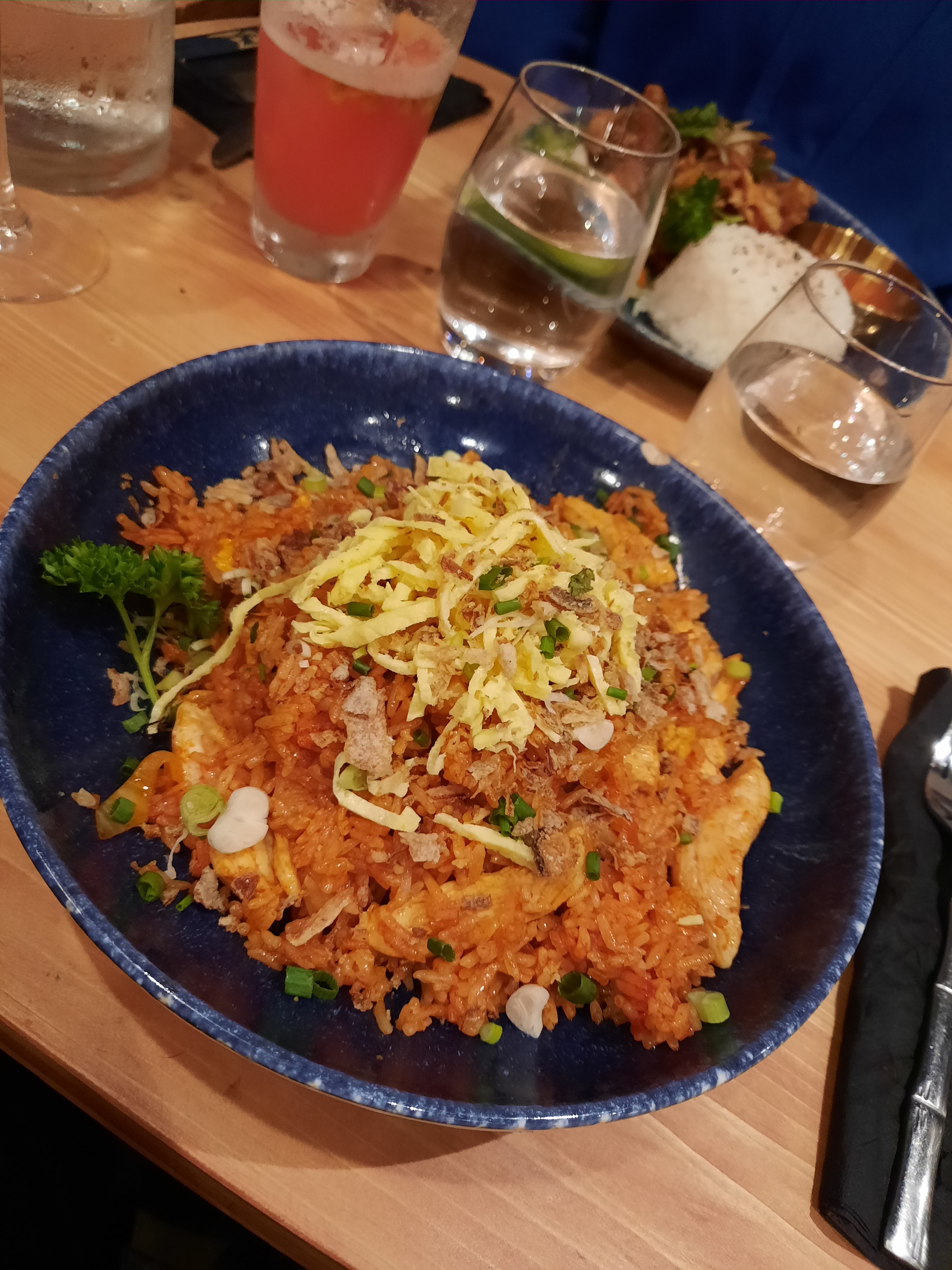 Posté le 10/11/2022 à 21:39"Le restaurant est calme même s’il est complet. Le cocktail Exotic Pump est bon et frais, plein de goûts avec deux fraises séchées et des morceaux de fruit de la passion dedans. Pour moi, le riz du Khao Pad avait un goût de tomate. Le boeuf était plus dur que tendre, peut-être dû à la qualité du produit ? Le serveur un peu tête en l’air et les apéritifs sont arrivés en même temps que les plats."