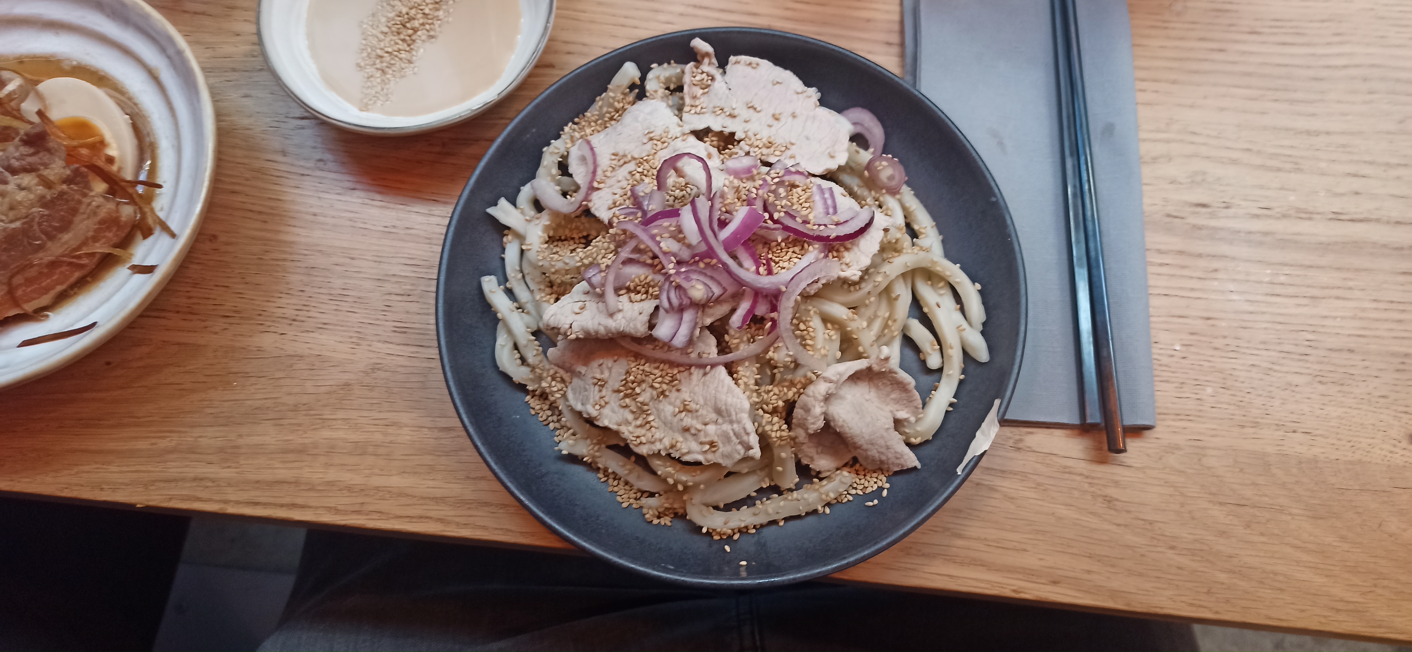 Superbe ambiance dans ce restaurant asiatique, une sorte de comptoir avec cuisine ouverte on retrouve bien l'image que l'on se fait d'un restaurant au japon par exemple. Pour le service nous avons eu nos entrées en même temps que notre plat, je ne sais pas si c'est normal et prévu auquel cas je corrigerais la note sans pb car à part ça ras. Pour la cuisine aussi, je ne suis pas du tout expert des udons mais nous nous sommes régalé, même si mon poulet était un peu sec ça restait super et copieux.