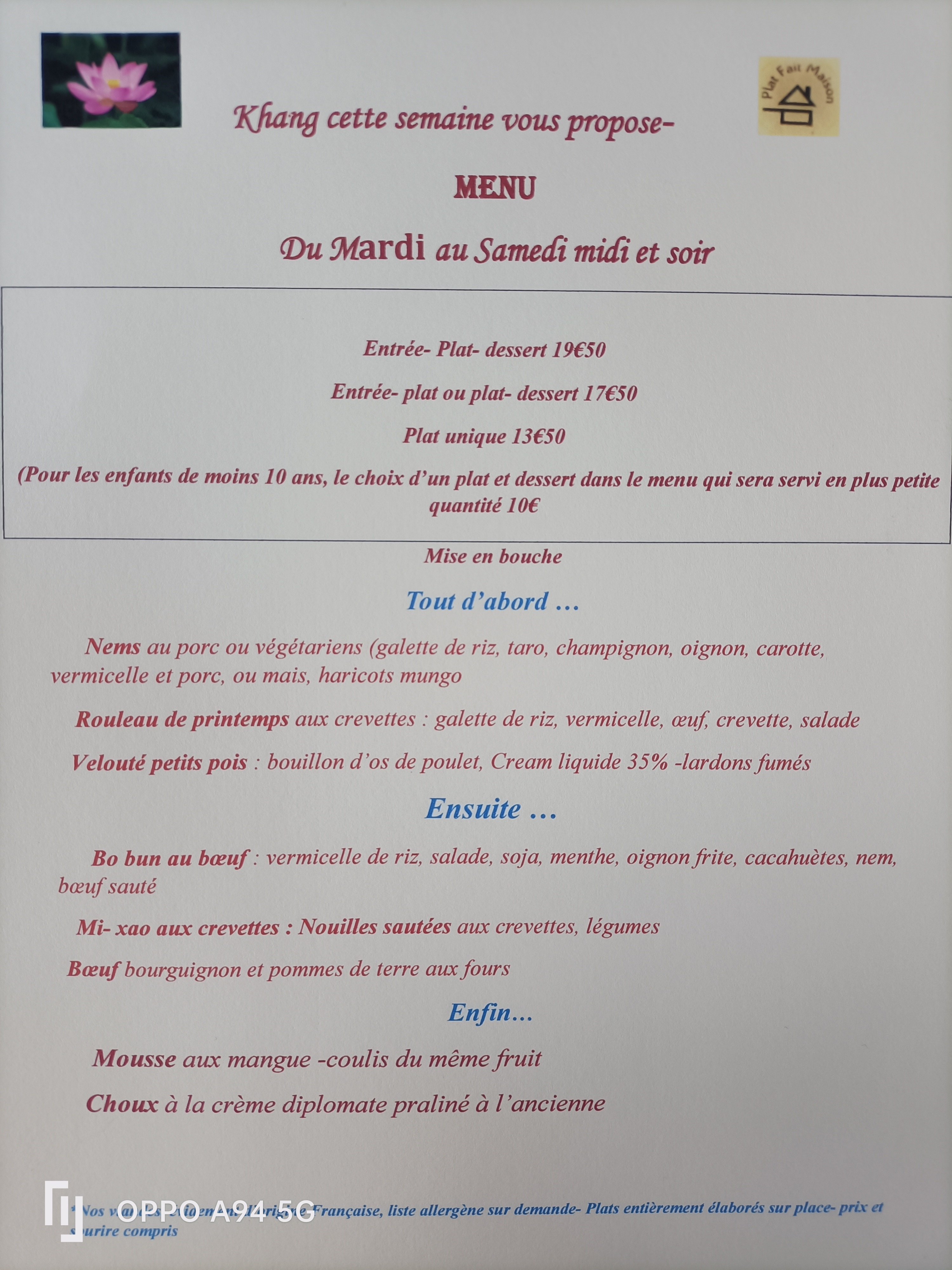 Incroyable, quelle belle surprise! Trois choix entrées trois choix plats et deux choix dessert: Fait maison assuré (il y a aussi le logo sur la carte). Délicieux! 3 serveurs/cuisiniers, on les voit cuisiner/on voit la cuisine quand on rentre. Ils sont adorables, bel accueil. Il faut réserver (victime de son succès). Le menu bien expliqué. Les nems végétariens et le saumon caramel étaient délicieux! Les plats sont très bien présentés!