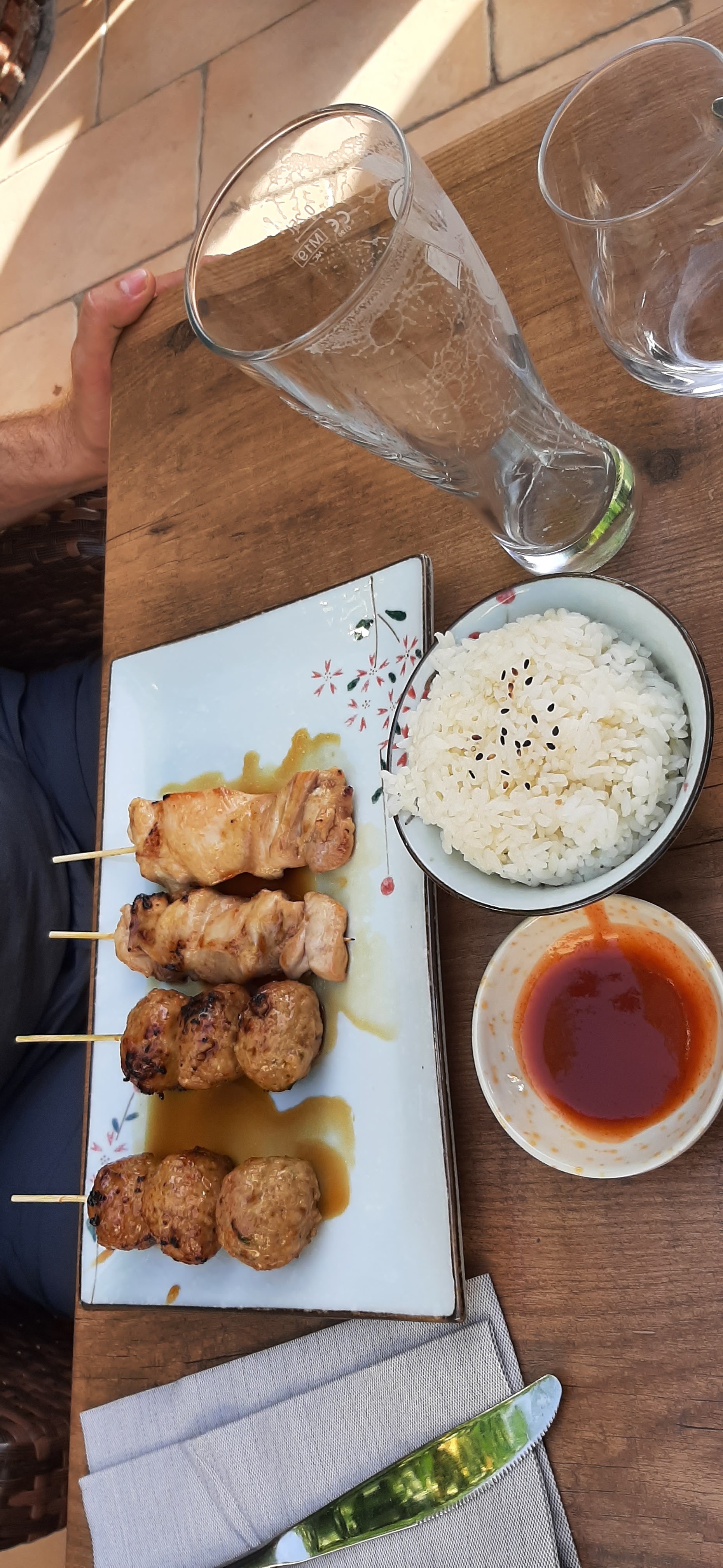 Posté le 18/07/2024 à 20:20" Malheureusement, la nourriture ici a été décevante. Nous ne pouvons pas comprendre les bonnes critiques. La bouteille d'eau effectivement obligatoire ne peut être obtenue qu'après des demandes répétées ; à la place de la bière sans alcool, une complètement différente avec de l'alcool est arrivée. La nourriture n'arrivait pas en même temps, mais plutôt à un intervalle assez long. Il manquait du riz dans le bœuf aux oignons et, malgré le souvenir, il n'est arrivé qu'à la fin. La soupe était tiède. Nous ne voulions plus de dessert non plus. Le service était plutôt désintéressé et moyennement amical. L'emplacement juste à côté d'un carrousel est plutôt bruyant et inconfortable. De plus, de nombreuses personnes fumaient sur la terrasse. "