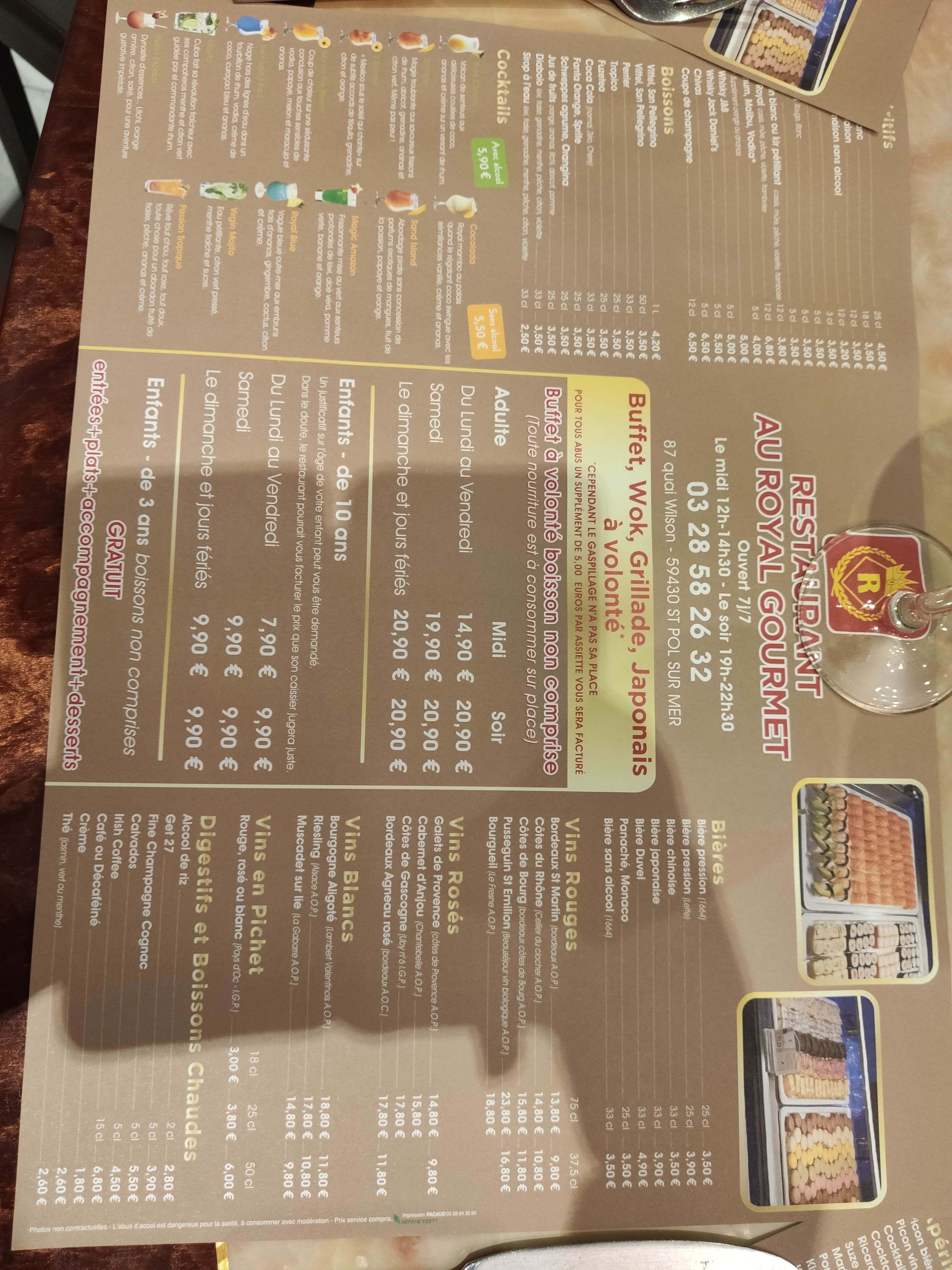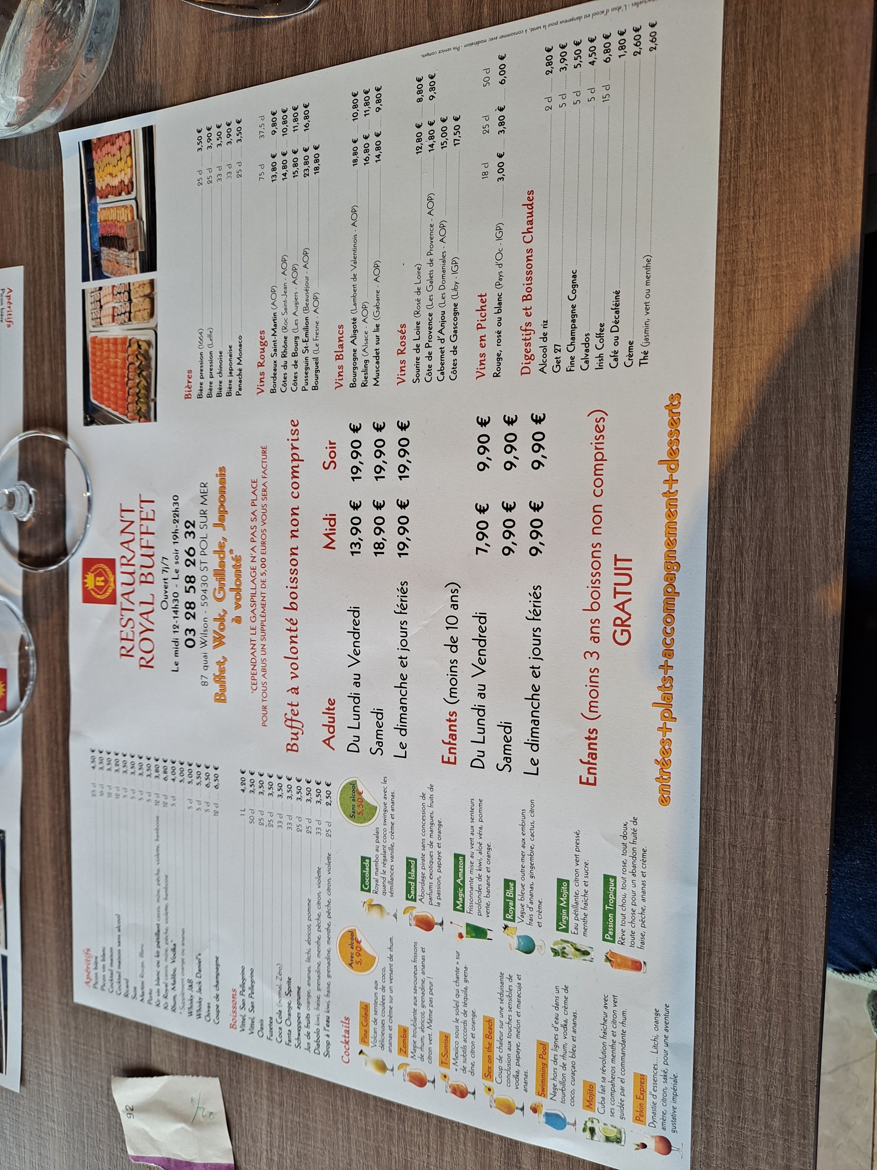 Posté le 14/07/2021 à 13:01"Restaurant royal buffet à volonté est formidable, propre et accueillant , inimaginable le choix du buffet, en plus des recettes asiatiques il y a frites , pizza ,gratin dauphinois, steack, saucisses, charcuterie, fromage et un très beau buffet de desserts avec fontaine chocolat lait et chocolat blanc 👍👍"