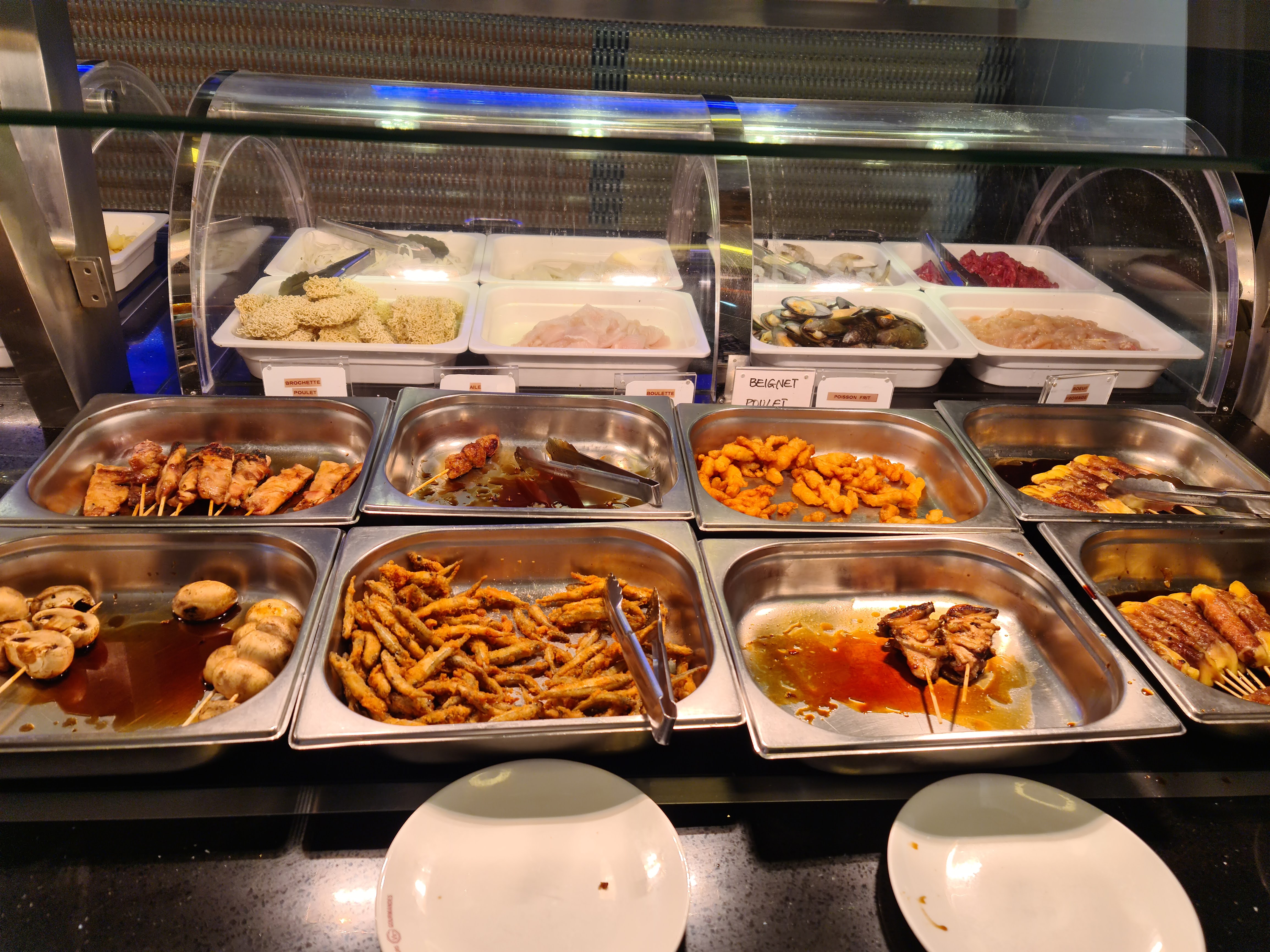 Dans l’ensemble bon buffet avec pas mal de choix dans la partie japonaise et du saumon frais, la partie wok/grillades aussi est pas mal.Le choix dans les desserts sont corrects, il y a même une fontaine en chocolat et un bar à bonbons.En ce qui concerne les fruits de mer et crustacés je pense qu’il y a mieux (la coquille des crevettes colle un peu à la chair) mais cela reste très correct. De plus un réaménagement a été fait pour que les plats soient couverts donc plus hygiénique. Il y a donc du choix et les plats sont assez bien exécutés