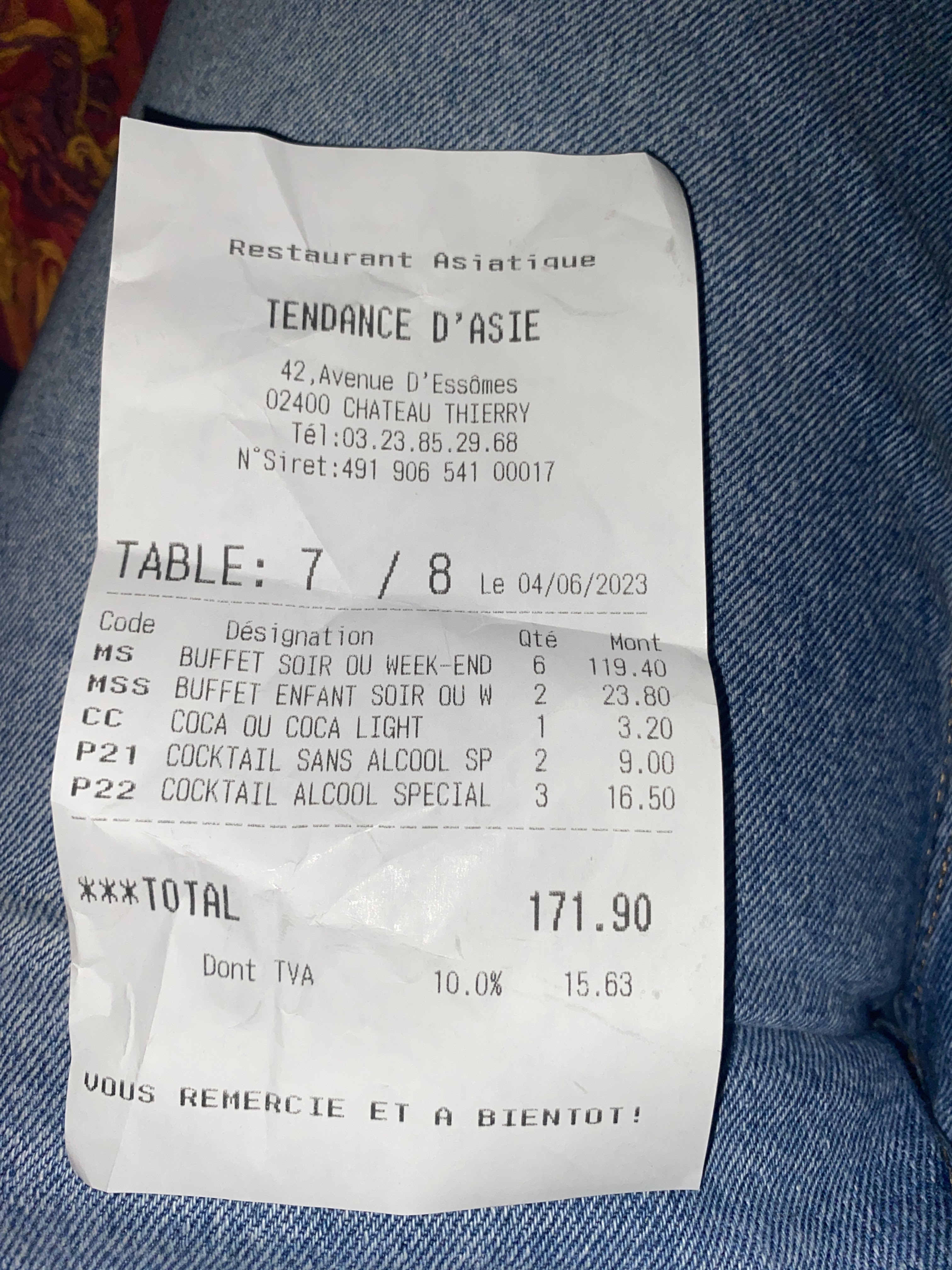 Posté le 20/06/2023 à 19:47"L’un des pires restaurants de mon existence !! Après quelques années à barouder et à tester quelques restaurants asiatiques du coin, mon préféré étant fermé nous nous sommes retrouvé avec ma femme ce soir aux tendances d’Asie… Accueil fort sympathique pour un buffet plus qu’habituel et les choses se gâtent dès la première assiette ! Où sont les maki ? Trois ou quatre se battent en duel pour finalement se reporter sur les nouilles sautées sauf que deuxième déception quand on se rend compte que les nouilles de chez Leclerc en sachet son meilleures… Bref à éviter simplement passez votre chemin sans hésiter !"