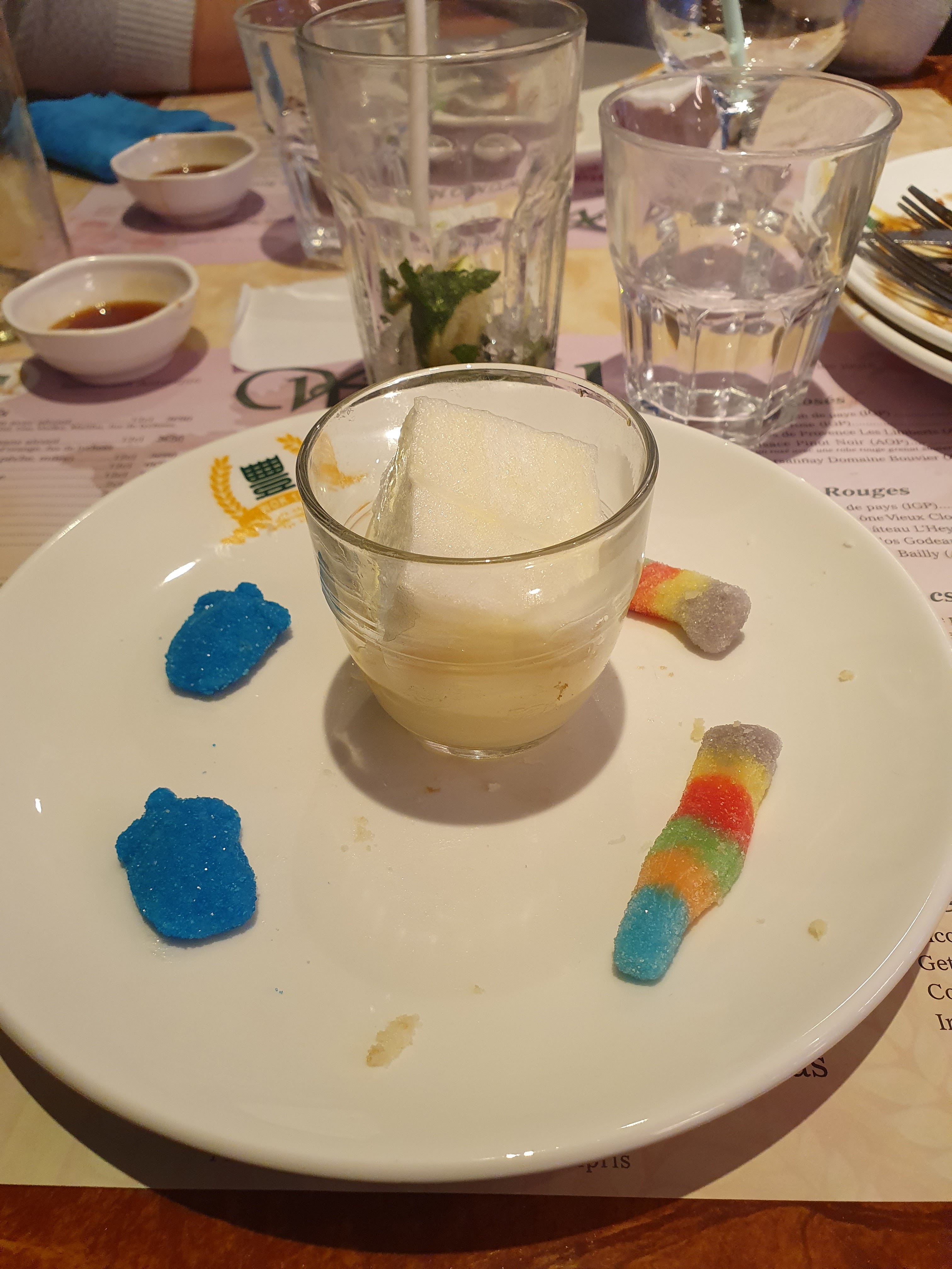 Arrivés à 5, nous donnent une table pour 4 dont une place bébé. Nous leur expliquons que le 5eme va manger sur ces genoux mais ils ne comprennent pas. Attendons qu’une table de 5 se libère, nous mettons la table nous mêmes.
