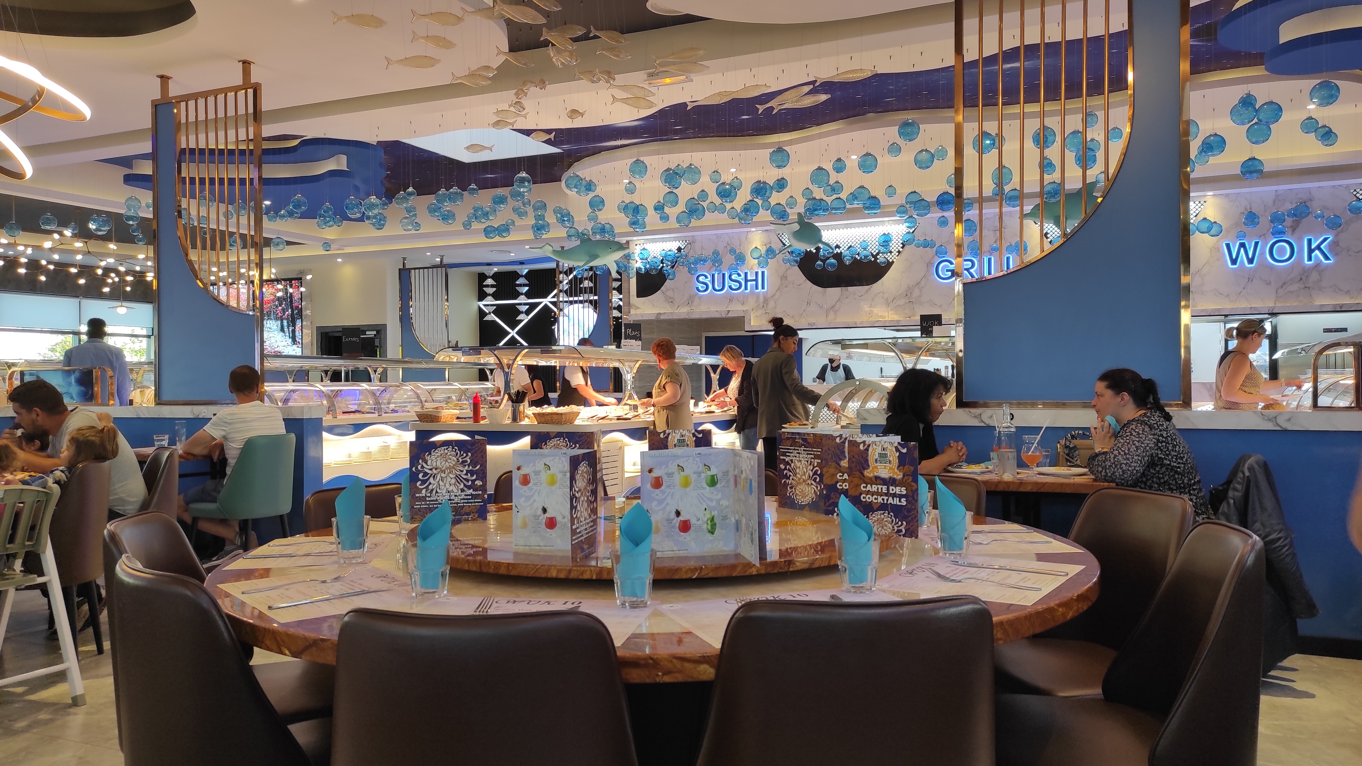 Très grand, bonne ambiance et belle déco, comme si on est dans aquarium. Bon et grand buffet bien organisé avwc plusieurs variété, en plus il y a un wok et de temps en temps il y a des offre de 10%sur le menu. Si c'est votre anniversaire, vous aurez une chanson de joyeux anniversaire :)