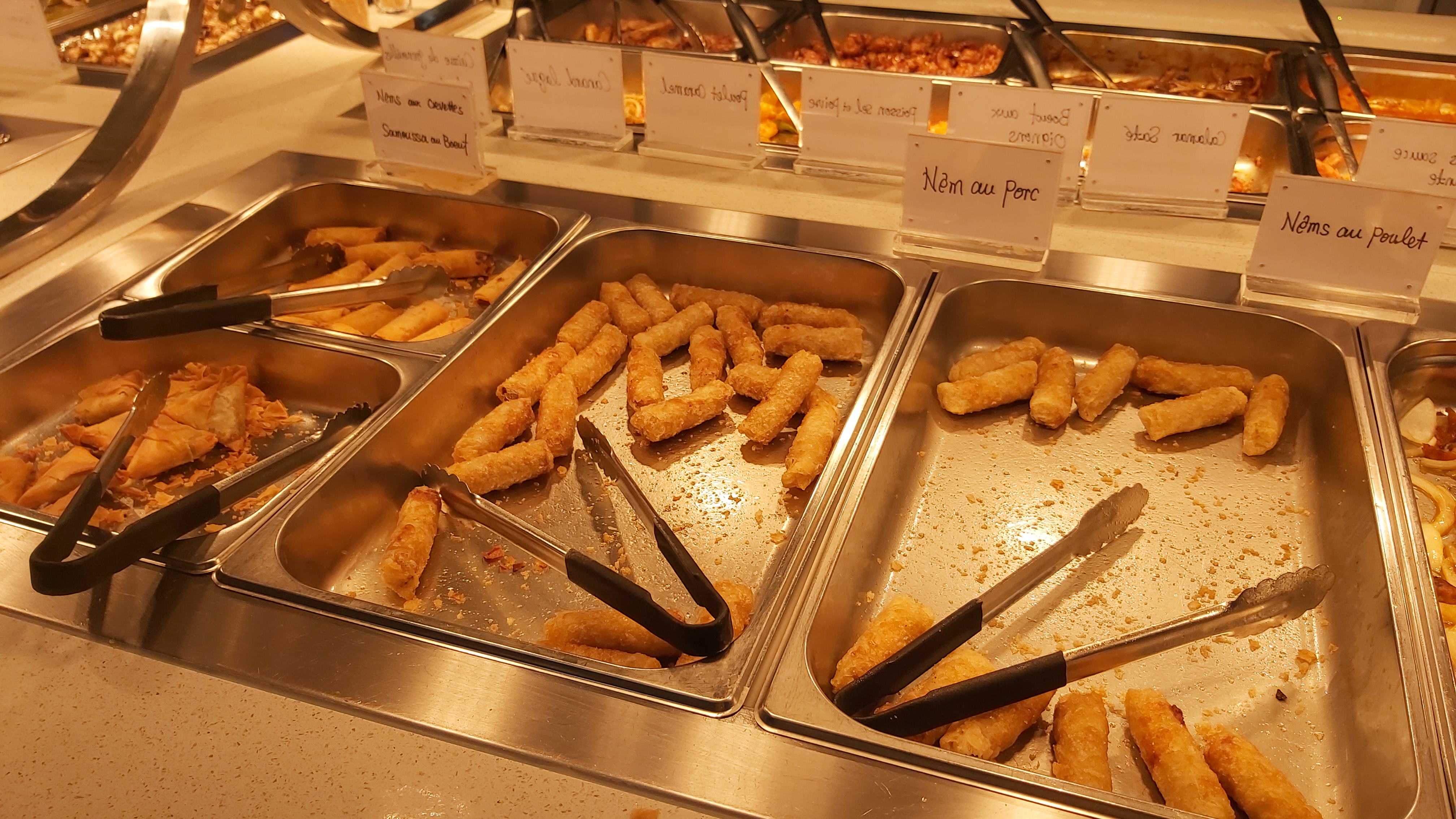 Beaucoup d choix pr ce buffet à volonté mais hélas la qualité baisse surtout sur les rouleaux d printemps tout/trop petits et à la feuille de riz tellement chewing gums qu'on a du mal à l'avaler Et les brochettes d poulet sont tres grasses et parfois 1 peu cartllagineuses, Quant au bœuf en sauce il est 1 peu dur à mâcher. La tarte citron est trop acide. Les tranches de saumon sont assez tendineuses. Donc certes si on s'en met plein la panse, on ne flatte pas vraiment les papilles surtout pr les fins palais...
