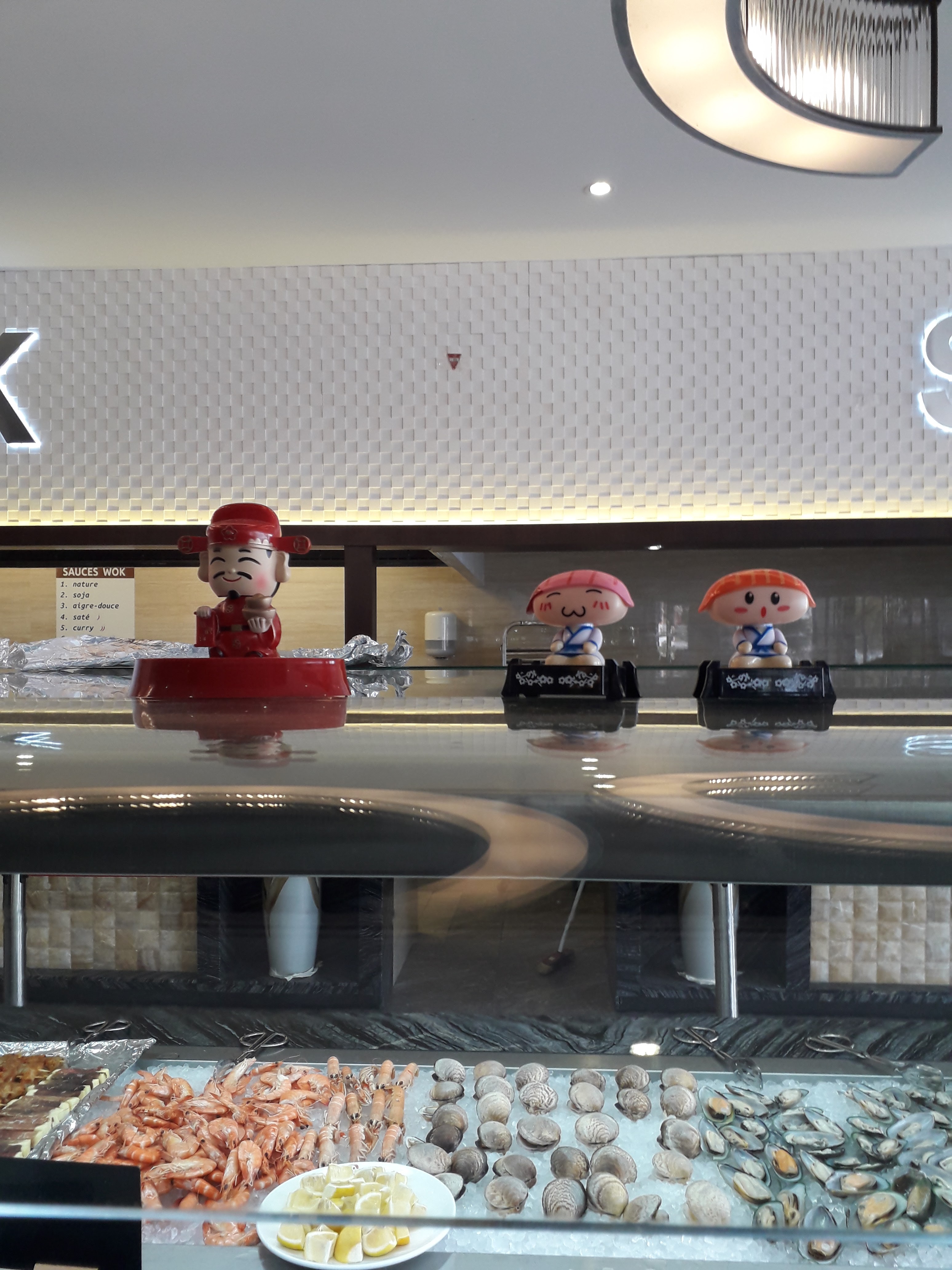 Beau restaurant. Serveurs/ses ne comprennent pas grand choses et a du attendre15min pour avoir une carafe d'eau. Buffet a volonté, bon, mais froid pour certains plats,(frites, brochettes,et tout se qui est pané crevettes, saint Jacques, crabes pané...). Sushi maki wok grillade.
