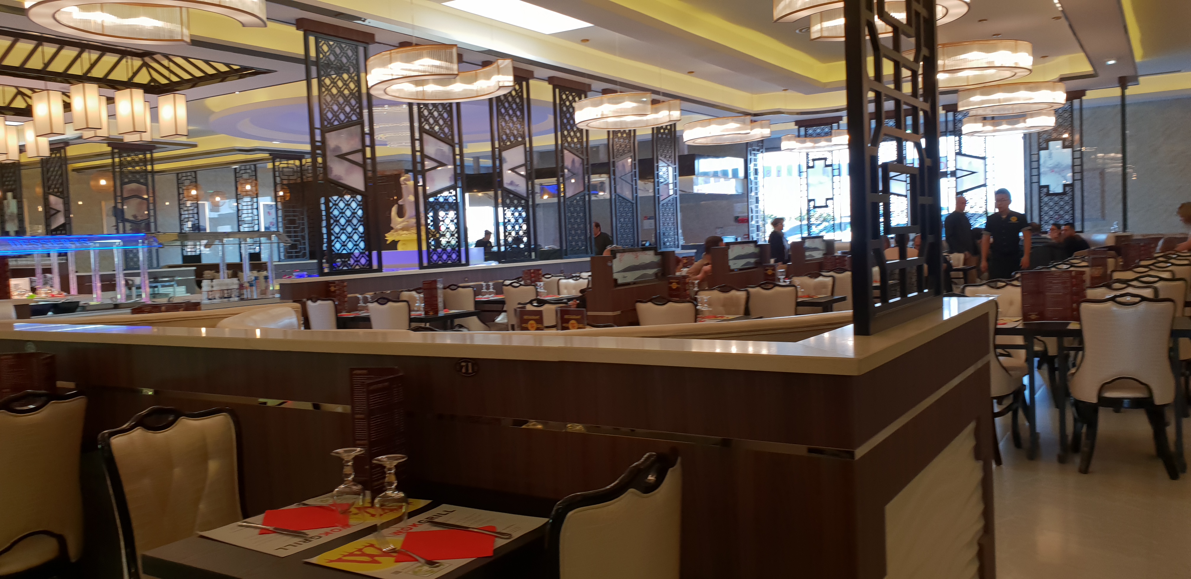 Posté le 11/05/2019 à 13:03"Très grande salle au décor plutôt sobre, dotée d'un écran TV taille XXL : du coup, l'endroit est bruyant. A part les légumes et les fruits frais, la nourriture est basique, plutôt bas de gamme. Attention à la fraîcheur et à l'hygiène. Ce restaurant affiche un logo wok d'or mais la qualité laisse à désirer. Il y a des confiseries à gogo pour les enfants. Compter moins de 13 € pour le déjeuner en semaine, y compris accès au grill."